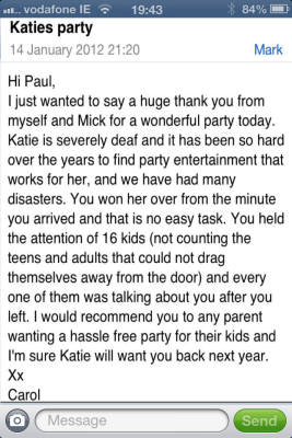 Would just like to say a big thank you to Paul for the amazing show he put on here on Easter Sunday 2013! He kept the kids entertained during the entire performance, constantly involving all the children and constantly on the move! We had a huge volume of kids on the day and Paul handled the crowd like a true professional. It was great to see so many happy and excited faces all afternoon. Paul is extremely friendly, enthusiastic and flawless as a kids entertainer. I would highly recommend Paul for any event - we will most definitely be using Paul for similar events in future!